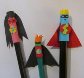 Każdy ma w domu kredki, nożyczki, klej i kawałki papierów. Wystarczy odrobina wyobraźni i można stworzyć rodzinkę superbohaterów! Zacznijcie od obklejenia końcówki kredki paskiem papieru, potem doklejcie peleryny, włosy i znaczki dla waszych bohaterów. Na końcu dorysujcie cienkopisem maski, miłej zabawy! Pozdrawiam Ania Nabel-Myszkiewicz