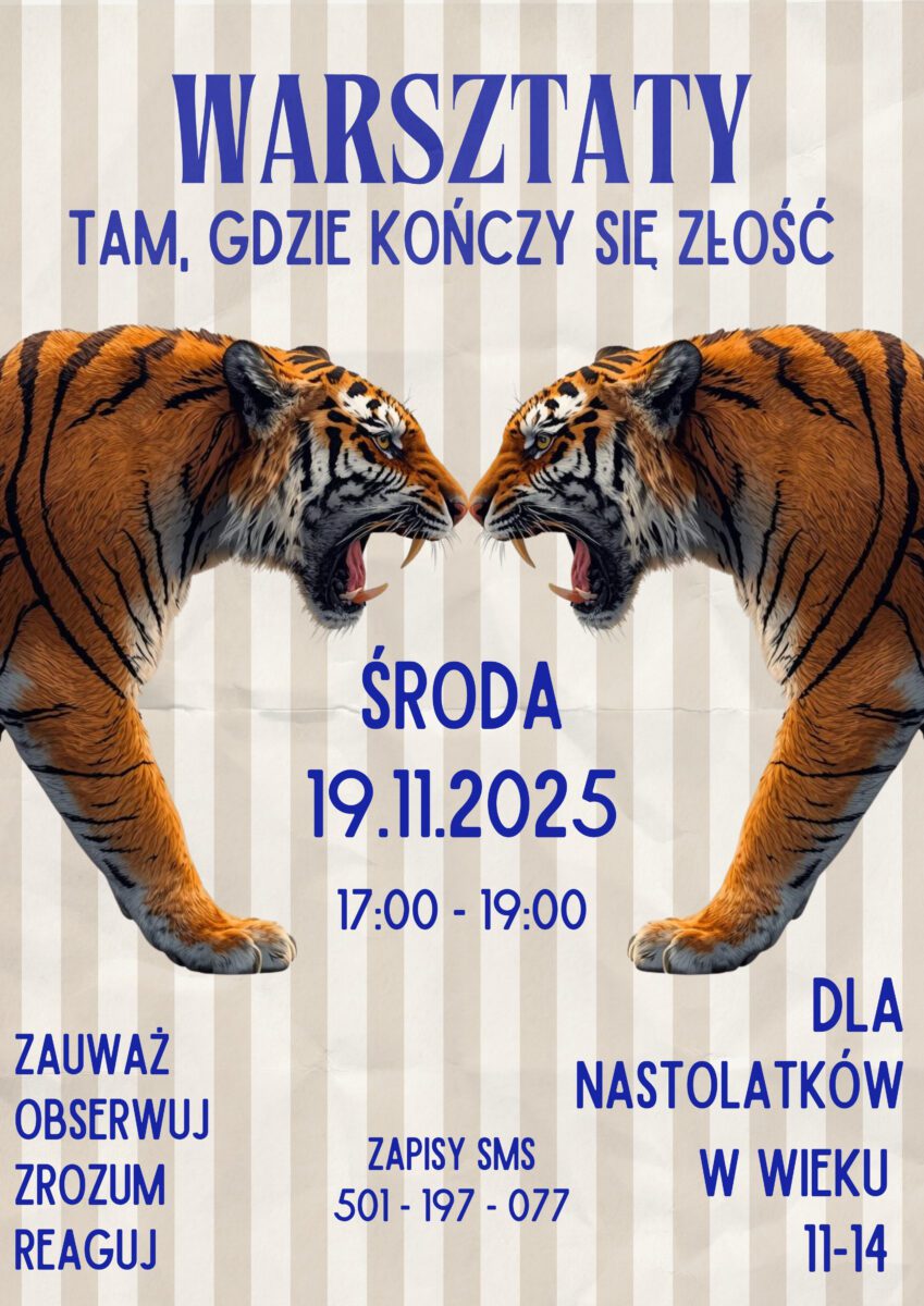 Warsztaty psychoedukacyjne „Tam, gdzie kończy się złość” to ciepłe i bezpieczne spotkanie dla młodszych nastolatków (11–14 lat), podczas którego porozmawiamy o emocjach, złości oraz o tym, gdzie zaczyna się agresja i przemoc. Uczestnicy będą mogli lepiej zrozumieć siebie, swoje reakcje i potrzeby, a także rozwijać empatię, uważność i umiejętność wspierania […]