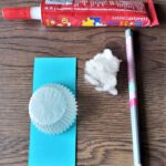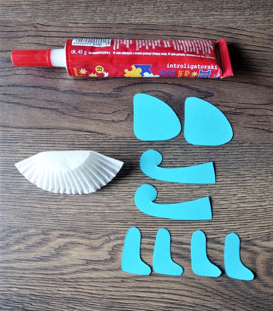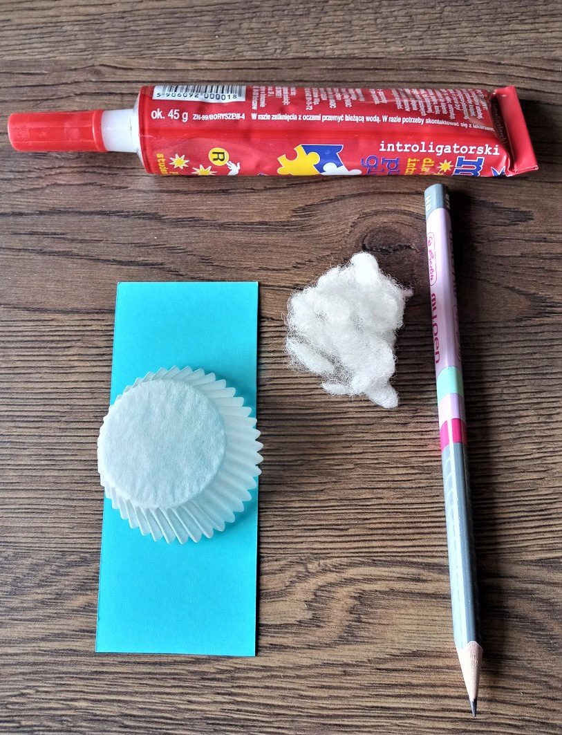 Przygotuj papierową foremkę do wypieku, klej, watę, sztywny kolorowy papier, pisaki i ołówek.