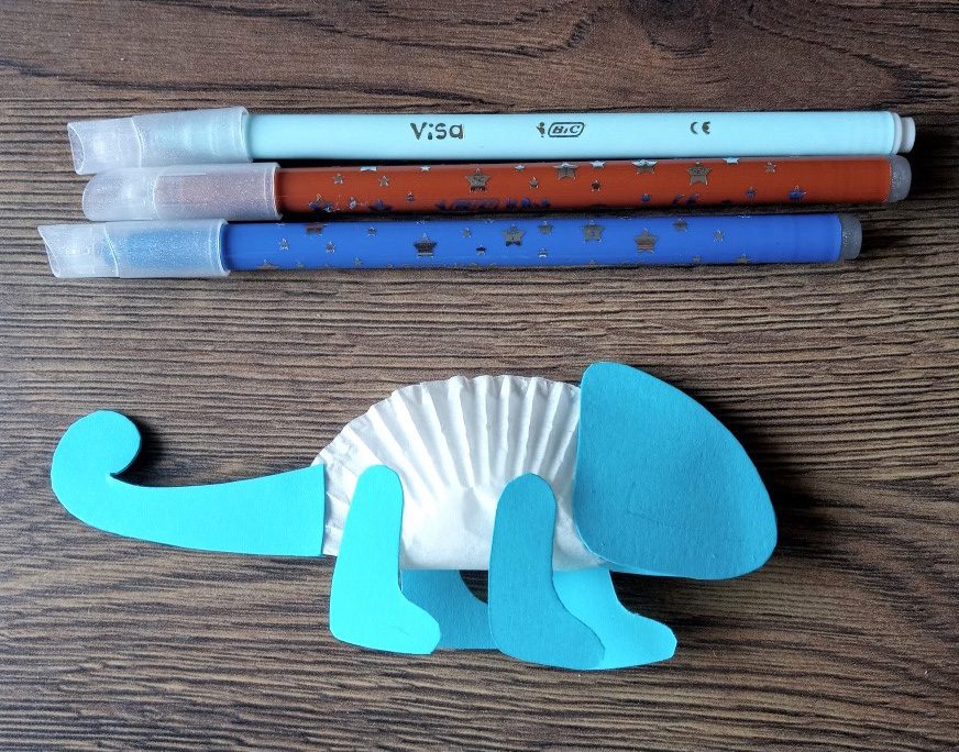Na sztywnej kolorowej kartce narysuj ołówkiem, a następnie wytnij elementy kameleonka: głowę, ogon, łapy ( zobacz na fot.)