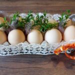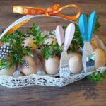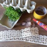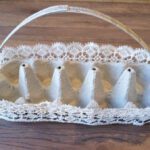 Koszyk Przygotuj opakowanie po jajkach, do wyboru klej lub taśmę dwustronnie klejącą, koronkę wstążkę Opis: Opakowanie rozdziel i z wieczka wytnij dwa paski. Paski doklej do pudełka, aby powstały uszka. Zobacz na fot. jak wygląda koszyczek z jednym uszkiem, a jak z dwoma i zadecyduj. (ucho jedno powstanie po sklejeniu dwóch pasków) Koronkę przyklej dookoła pudełka i udekoruj wg pomysłu. Możesz wykorzystać dekoracje wykonane wcześniej, np. zajączki z rolek.