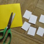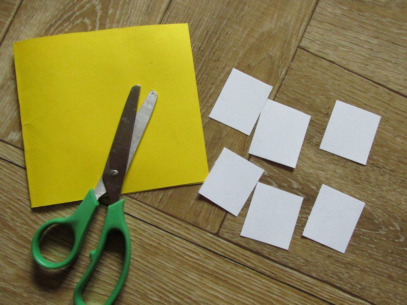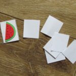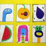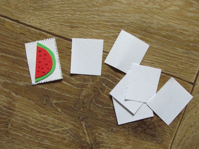 Na początek trzeba wyciąć 6 małych białych karteczek równej wielkości. Naklejamy je na kolorową kartkę w równych odstępach, w dwóch rzędach. Następnie z resztek kolorowego papieru tworzymy na nich mini postacie, zwierzątka, owoce – wszystko co Wam przyjdzie do głowy. Szczegóły można dorysować. Przyjemnej zabawy!