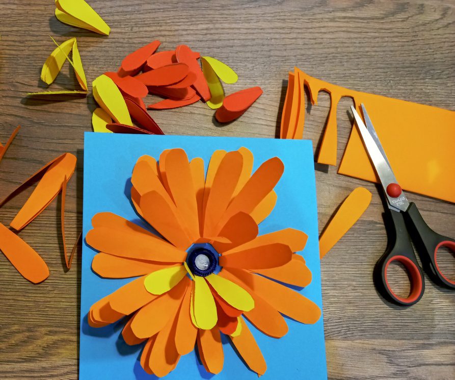 Na kartkę z bloku technicznego przyklej środek kwiatka, możesz wykorzystać guziki, koraliki lub wyciąć kółeczko z kolorowego papieru.