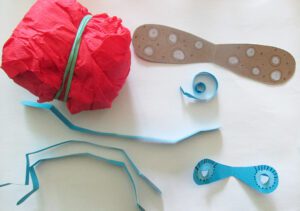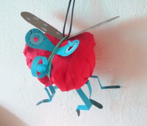 Jeśli nie masz w domu kleju, nie martw się! Bez niego też wykonasz prace plastyczną. Zgnieć dowolny papier w kulkę i ściśnij go gumką recepturką. Wytnij skrzydełka, oczy w formie maski, 3 pary nóżek i 1 długi pasek. Możesz te elementy ozdobić. Skrzydła, oczy i nóżki przełóż przez gumkę. Długi pasek zwiń na kredce- w ten sposób powstanie trąbka dla naszego owada i też przełóż ja przez gumkę.  Nóżki możesz pozaginać, żeby miały ciekawszą formę.