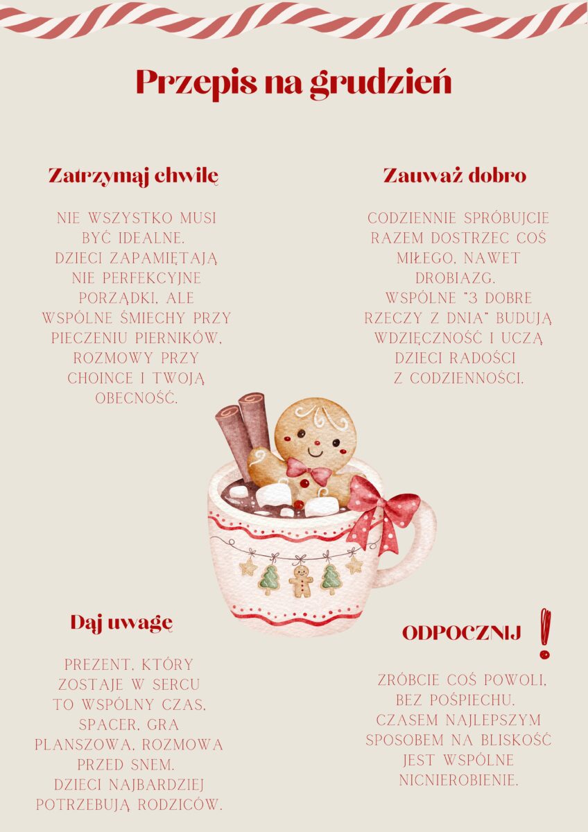 Przedstawiamy nasz “przepis na grudzień” 🎄☕ – krótką inspirację dla rodziców i dzieci, stworzoną po to, by końcówka roku stała się czasem bliskości, spokoju i rodzinnych rytuałów. 💛