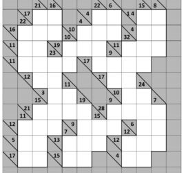 KAKURO (krzyżówka liczbowa) W puste kratki należy wpisać cyfry od 1 do 9, tak aby zgadzały się sumy poziome (podane nad ukośną kreską) oraz sumy pionowe (pod ukośną kreską ) wpisanych liczb. W obrębie jednej sumy składniki nie mogą się powtarzać