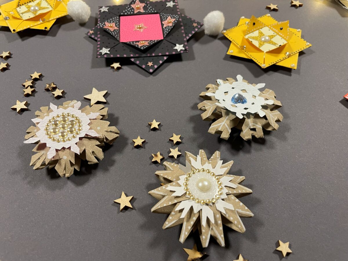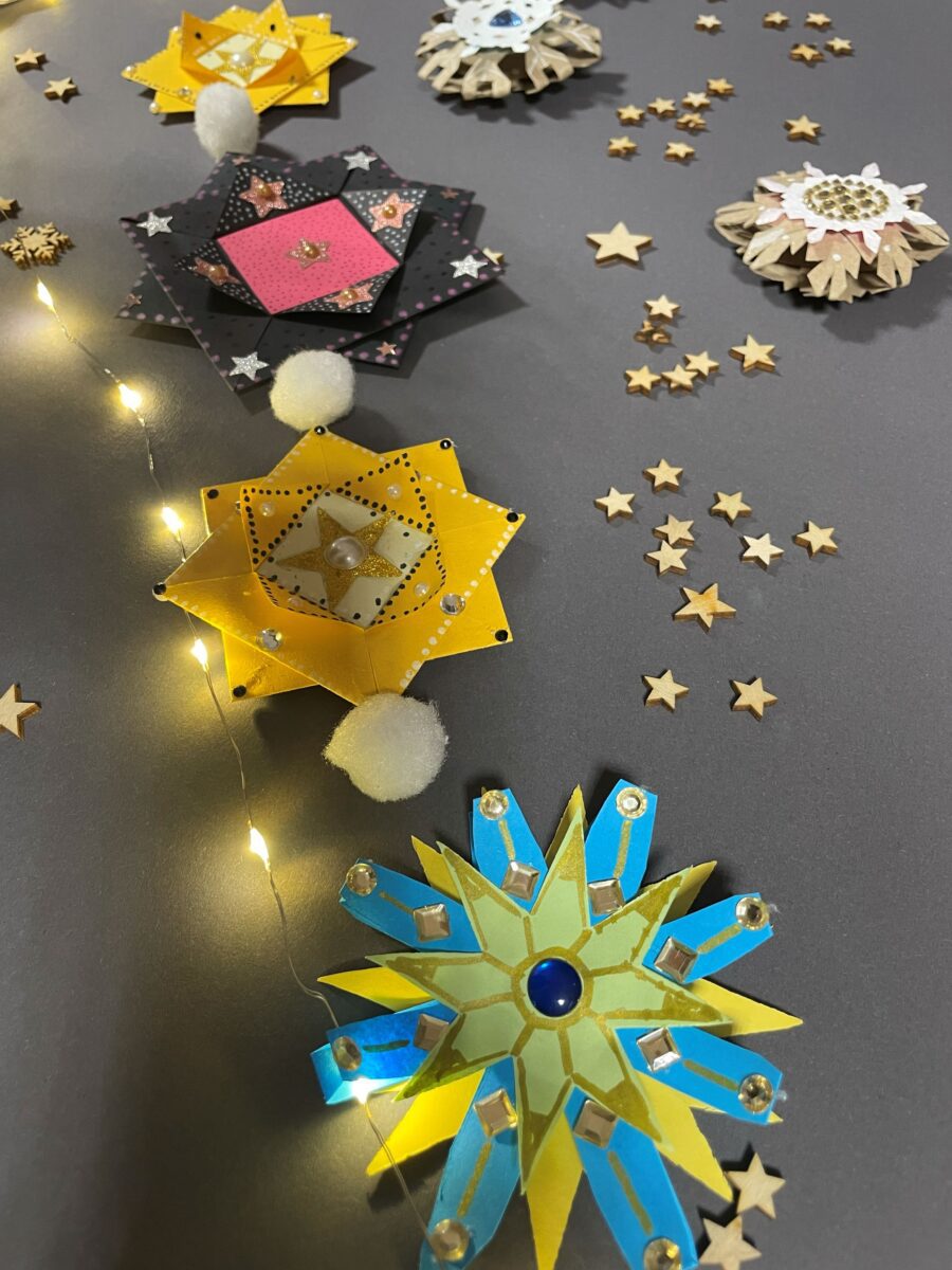 W pracowni sztuki dekoracyjnej uczestnicy zajęć wraz z p. Agnieszką Filar i p. Olgą Lemińską tym razem stworzyli miniaturowe, artystyczne formy dekoracyjne – gwiazdy - nawiązujące do świątecznego czasu. Zastosowane techniki i różnorodność materiałów pozwoliły wszystkim na indywidualne wykonanie małych arcydzieł. Serdecznie zapraszamy do obejrzenia efektów działań warsztatowych.